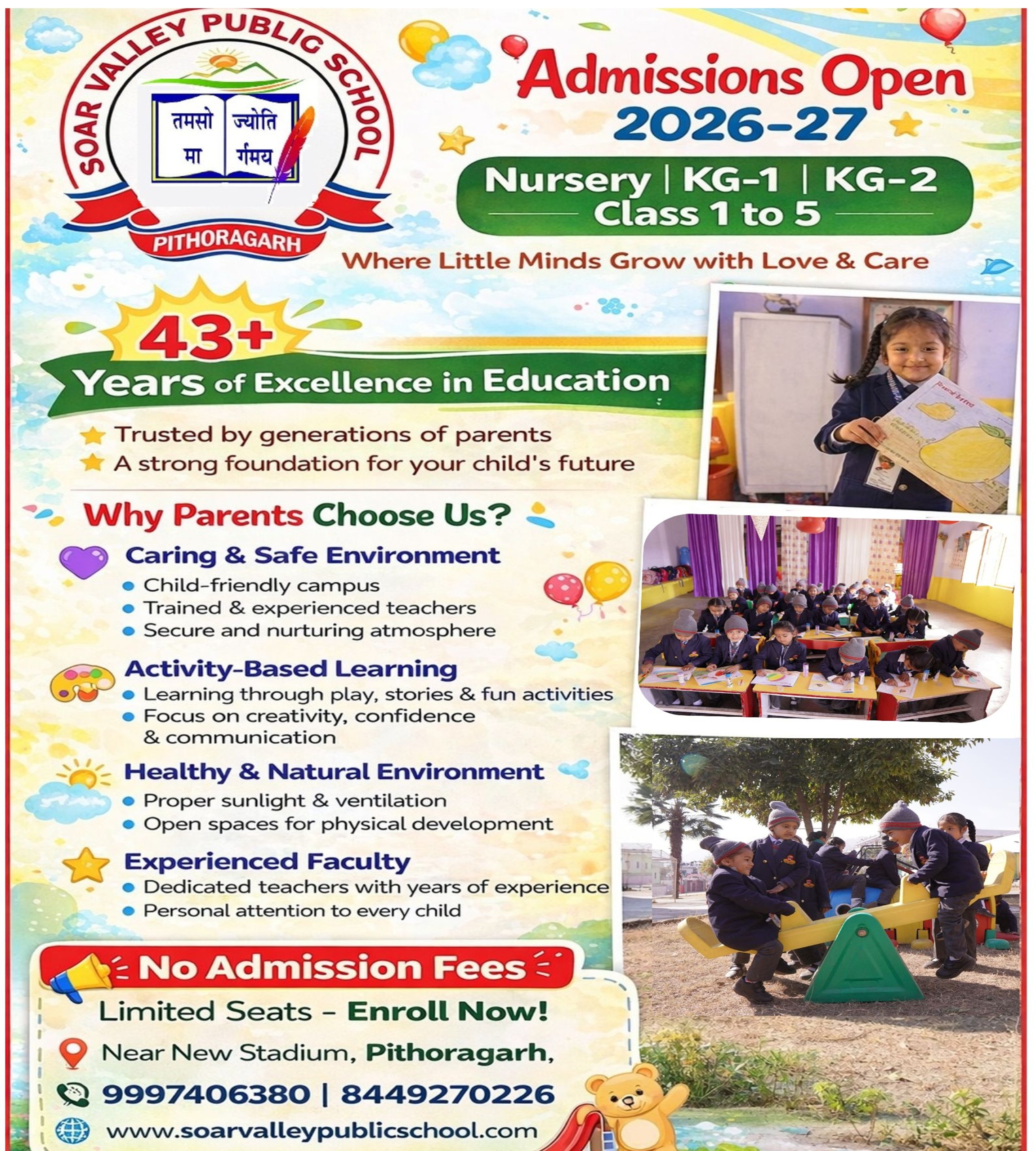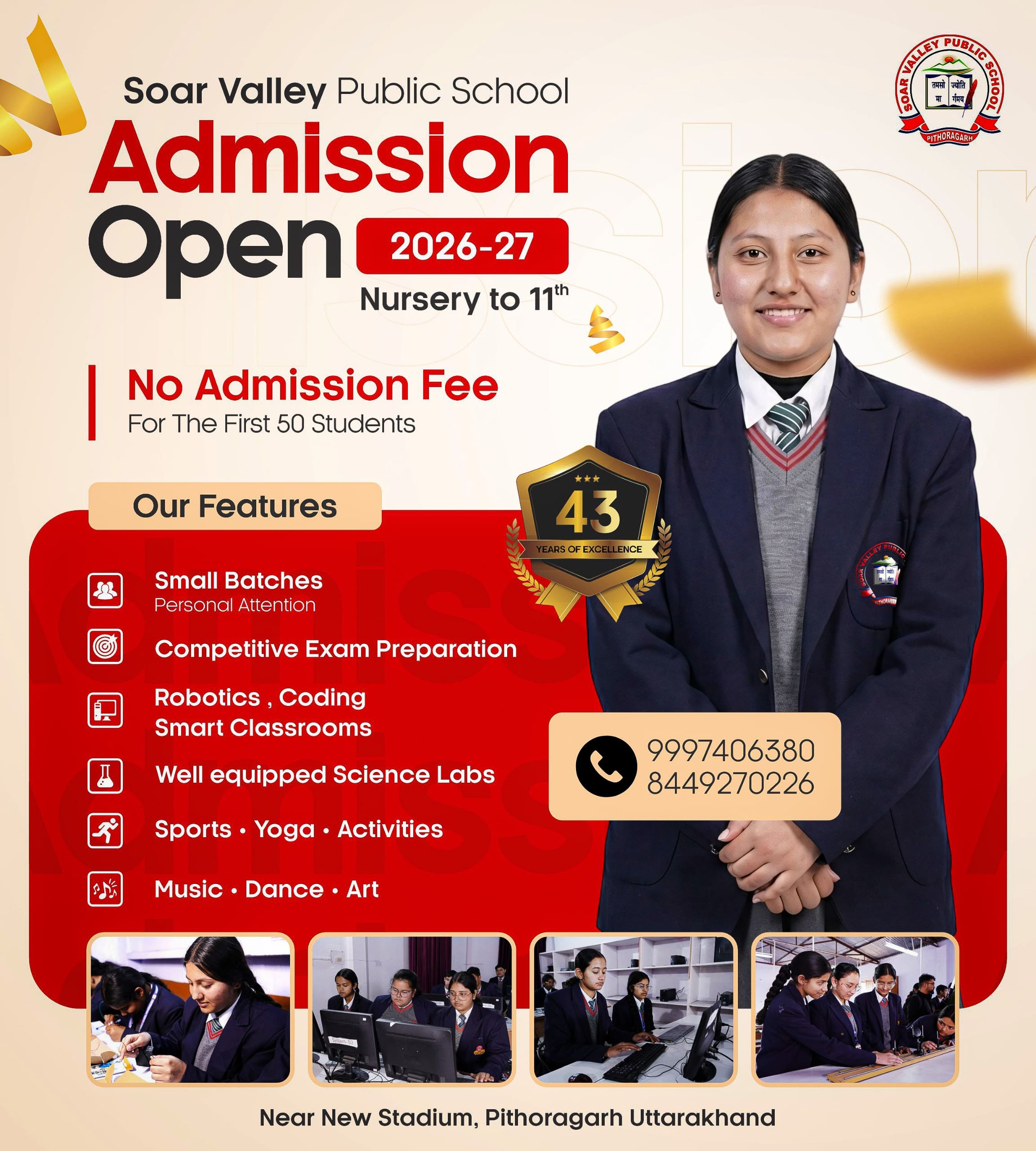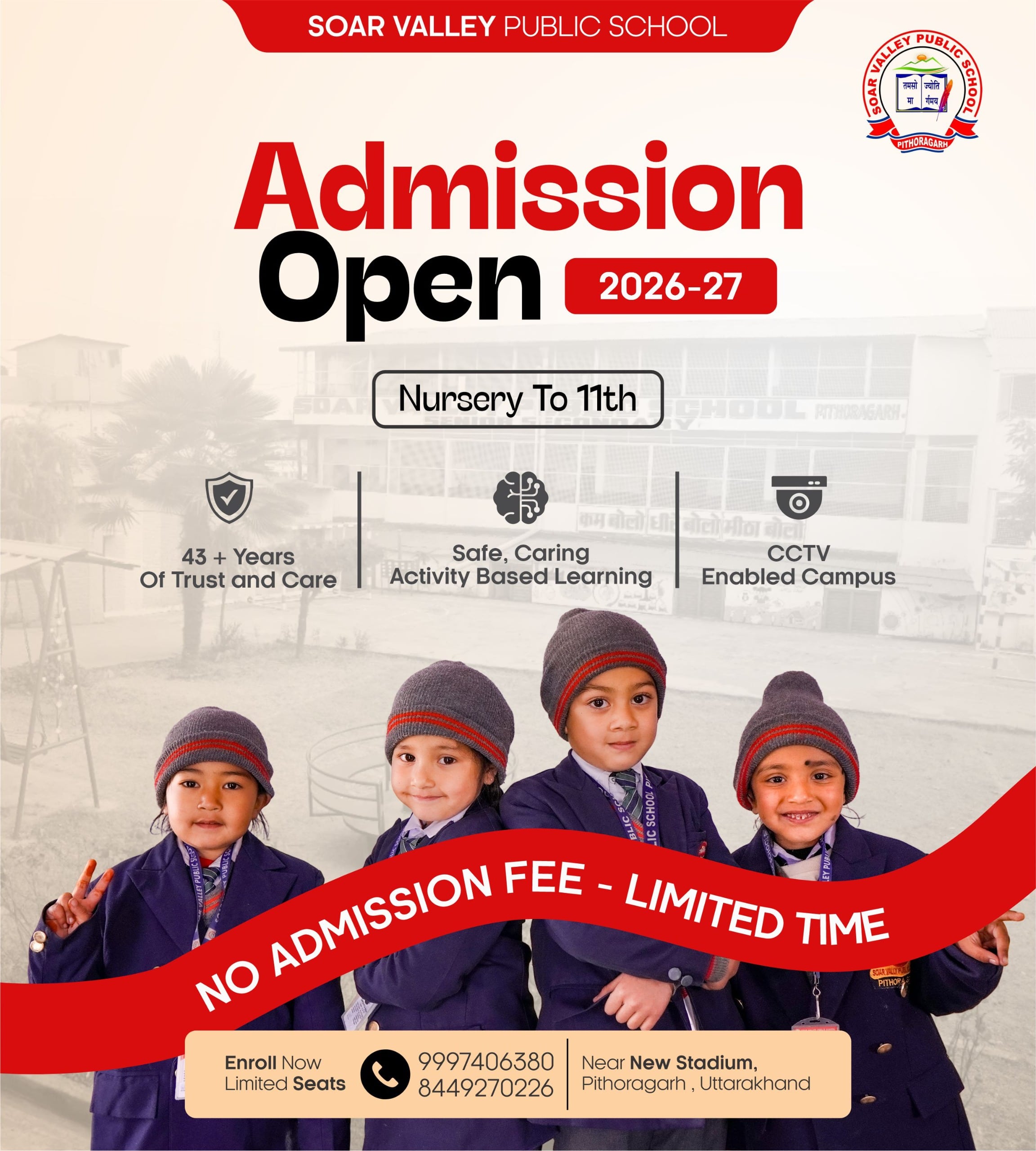 Soar Valley Public School, Pithoragarh is a Senior Secondary private school affiliated to CBSE New Delhi. Established in 1982, the school stands as a symbol of academic excellence and strong values.